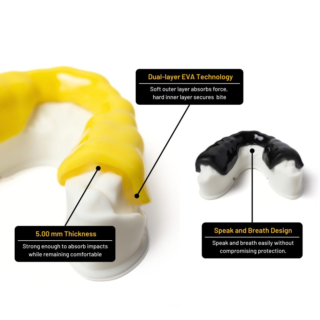 The soft outer layer absorbs impact while the firm inner layer stabilizes your bite. With a 5.00 mm profile for balanced strength and comfort, plus a speak-and-breathe design, this mouthguard keeps you protected without slowing you down.